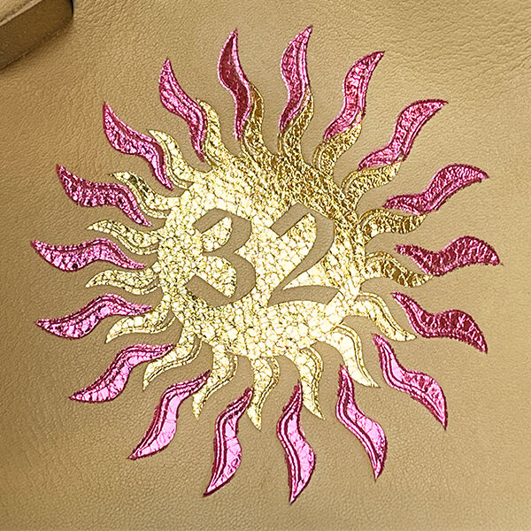 Since my father's passing, a sense of peace for me has been to look at the sky and see the sun beaming through the clouds which brings me a tremendous sense of love and comfort. That is where the sun stamp in the palm comes from, and the metallic color is the brightness of the sun through the clouds.
